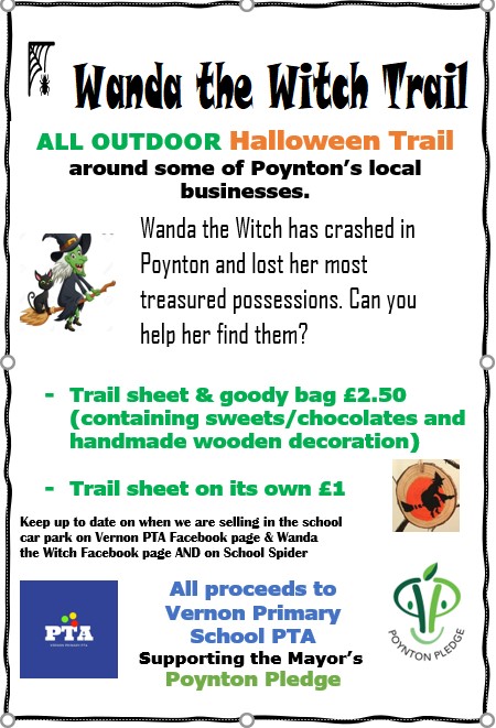 The PTA will be selling trail sheets for the Wanda the Witch Trail in the school car park today before pick up 2.30pm – 3.10pm. We are also planning on selling them next week – watch this space for further dates.