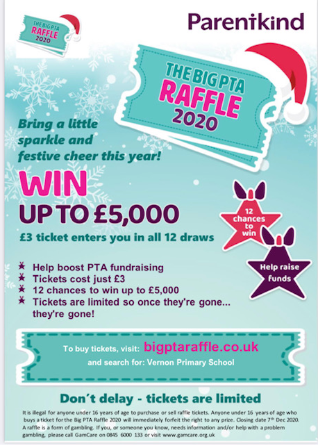 PTA raffle tickets can be bought from www.bigptaraffle.co.uk. It raises money for school but you also have 12 chances of winning up to £5000 (if all tickets are sold). The draws will run daily from 7th December to the 18th December.